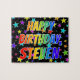 Ce design amusant, excitant, sur le thème de l'anniversaire de puzzle a le message "HAPPY BANTHDAY, STEVEN" avec les personnages ayant un spectre arc-en-ciel coloré inspiré motif dégradé, ainsi qu'un motif arrière - plan étoiles vibrant. Un puzzle coloré comme celui-ci pourrait être une façon amusante d'envoyer des voeux d'anniversaire à quelqu'un nommé Steven. [~Z0000468]