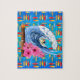 L'art surfant d'une monte de surfer une grande vague avec une statue et une ketmie flamboyantes de tiki fleurit.