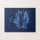 Puzzle avec le symbole zodiaque pour Pisces en bleu argenté doux, recouvert d'étoiles de la constellation, contre un arrière - plan ciel étoilé classé de bleu nuit profond à noir.