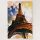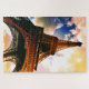 Un aperçu de la Tour Eiffel à Paris, France, avec des nuages roses et jaunes contre un ciel bleu et une tour en métal rouge.
