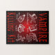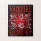 L'image est une illustration stylisée d'un kit de meurtre de vampires. Les mots "VAMPIRE" et "KILLING KIT" sont écrits en gros caractères rouges, de style gothique, respectivement en haut et en bas. Entre les deux, il y a six dessins blancs dessinés d'objets traditionnellement utilisés pour tuer les vampires : un pieu et un maillet, une bible, un pistolet avec des balles en argent, une bouteille d'eau sainte, de l'ail et une croix. Un cadeau parfait pour les Goths et les amateurs de vampire.