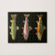 Le design présente trois belles truites : l'omble de fontaine, le salvelinus fontinalis; Truite arc-en-ciel, oncorhynchus; et la truite Brown, salmo trutta. L'art est tiré de trois peintures originales d'aquarelle réalisées par M. Trout Whiskers. Fait un cadeau unique pour tous ceux qui aiment la pêche ou l'ichthyologie. Cette même conception est disponible sur de nombreux autres objets. Des puzzles sont également disponibles avec d'autres types de poissons.