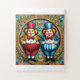 Tweedledum et Tweedledee, personnages emblématiques de "Alice au pays des merveilles". Ils se tiennent côte à côte, portant un pantalon rayé coloré (rouge et blanc pour l'un, bleu et blanc pour l'autre), des vestes jaunes assorties, des cravates d'avant et de grands casquettes. L'arrière - plan est orné d'un style vitrail avec des coeurs, des motifs floraux et des couleurs vives.