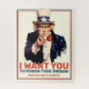 Ajoutez votre propre texte, l'affiche Oncle Sam "I want You", basée sur l'affiche de J. M. Flagg de 1917, qui était basée sur une affiche originale britannique Lord Kitchener de trois ans plus tôt. Il servait à recruter des soldats pour la Première Guerre mondiale et la Seconde Guerre mondiale. Flagg a utilisé une version modifiée de son propre visage pour Oncle Sam. Cliquez sur le bouton "Personnaliser" ou "Modifier le design" pour ajouter votre propre texte, couleur, police ou taille et créer votre propre cadeau original (ou un cadeau spécial pour vous-même !). Que diriez-vous du nom de quelqu'un, d'un anniversaire ou d'un voeux de Noël, d'un lieu et d'une date ?.. Ou, si vous voulez, n'ajoutez aucun texte et n'ayez pas l'image en soi. N'OUBLIEZ PAS DE CHOISIR LE NOMBRE CORRECT DE PIÈCES JIGSAW ! Réglez votre photo et votre texte si nécessaire. Piece & Quiet© - Tous droits réservés.