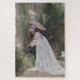 Ce dessin présente un tableau de l'artiste français Victor Gabriel Gilbert (1847-1933). Elle montre une élégante jeune femme vêtue d'une longue robe blanche. Elle est dans un jardin et elle tient une canette d'arrosage car elle s'occupe de ses plantes et de ses fleurs. Un petit chien blanc est assis sur un banc dans le jardin. La dame tient un parasol rose. Il y a une treillis en bois contre le mur de la maison de la femme où poussent également des plantes fleuris.