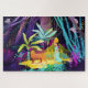 Une jeune fille aux cheveux foncés dans une belle Sari avec une cruche d'eau sur la tête marche à travers la forêt tropicale à côté d'un léopard apprivoisé entouré de palmiers, buissons, fleurs colorées et arbres tropicaux. L'atmosphère magique et chatoyante de l'illustration nous emmène dans les vieux contes de fées familiers. Un puzzle merveilleux pour toute la famille pour passer une soirée avec des proches.