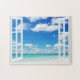 Belle aquarelle couleur de l'eau bleu cristal et tout aussi brillant ciel bleu par la fenêtre ouverte à votre villa de vacances de plage de sable blanc tropicale.
