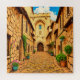 Une rue pavée pittoresque est bordée de charmants bâtiments en pierre ornés de plantes verdoyants dans des pots. L'entrée voûtée de l'arrière - plan ajoute une touche historique, rehaussée par le ciel bleu vif au-dessus.