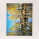 Ce puzzle de 526 pièces présente des couleurs vives et contrastées sur une image d'automne de vaches Holstein noires et blanches au trou d'eau en dessous et parmi un peuplement d'arbres en feuille jaune, or, vert et orange.