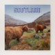 Les vaches des Highlands broutent paisiblement dans une vallée luxuriante et herbeuse entourée de collines rougeâtres et brunes. Des montagnes enneigées encadrent la scène sous un ciel bleu clair.