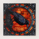 Décoré de vitraux, un corbeau déplaisant éffrayant tourne son regard vers le spectateur.