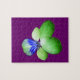 Ce superbe puzzle présente une photo d'une fleur sauvage de Pansy. La photo a été colorée artificiellement, ce qui donne un sac avec des pétales verts brillants et un centre bleu vif. L'arrière - plan est violet pour compléter les couleurs de la fleur.