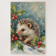 A sweet vintage Christmas painting featuring a hedgehog nestled in holly and snow. A charming and nostalgic woodland scene perfect for holiday cards and décor.