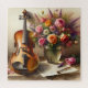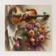 Aquarelle de l'art de l'air représentant un violon penché contre le mur, des partitions et un vase de fleurs en verre.