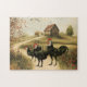 This jigsaw puzzle features a farm and field scene with vintage botanical artwork of White Faced Black Spanish Bantam Roosters and Chicken. The poultry artwork is from a vintage illustration in the public domain, available via the Flickr Commons, and it's placed on a farm journal background with a barn and autumn trees. The White Faced Black Spanish Chicken —often called "Clown Faced Chickens"—are a rare heritage breed available from several major hatcheries and specialty breeders.