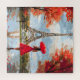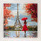 Une femme gracieuse avec un parapluie rouge se promène vers la Tour Eiffel dans une douce brise automnale. Charme parisien romantique dans les tons rouge et or.