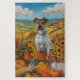 Célébrez la beauté de la chute avec cette peinture vibrante d'un chien assis à côté d'une généreuse moisson de Thanksgiving. Les riches couleurs d'automne des citrouilles, des tournesols et des paysages rustiques des fermes créent une atmosphère chaleureuse et accueillante, parfaite pour toute décoration saisonnière amoureux des chiens.