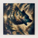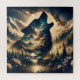 Photo dans une image. Un loup hurle sur la lune avec des montagnes et un arrière - plan de forêt.
