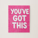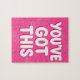 Playful motivational text chunky rounded typography in white on pink textured background.