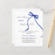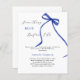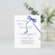 Un élégant arrière - plan blanc, décoré d'un arc bleu foncé. Personnalisez et ajoutez un nom et des détails du parti. Texte : Quelque chose de bleu avant moi. 1 feuille = 1 invite imprimé bord à bord.