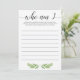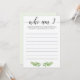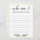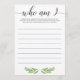 Vous cherchez un jeu de brise-glace à jouer à votre baby shower? Jouez Qui suis-je avec ces cartes de jeu verdoyantes avec des feuilles d'aquarelle. C'est l'ajout parfait à votre jardin ou à votre baby shower à thème botanique et c'est un succès à votre fête ! Laissez vos invités de baby shower écrire un souvenir personnel qu'ils ont avec la future maman. Quand tout le monde a listé un souvenir, lisez-les à haute voix et laissez la maman deviner avec qui elle a eu le souvenir. Si elle ne se rappelle pas, l'invitée gagnera !