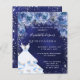 Une invitation moderne, élégante et glamour pour une Quinceañera, 15ème anniversaire. Un arrière - plan de marine avec des étincelles de parties scintillant faux argent, une robe et des roses bleus, des fleurs. La couleur bleue de l'arrière - plan est inégale. Le nom est écrit avec un script de style moderne écrit à la main. Personnalisez et ajoutez les détails de votre fête.
