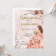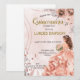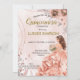 Elegant invitation for a debutante party in shades of rose with touches of floral with an illustration of a dress.