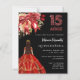 Une invitation moderne, élégante et glamour pour une Quinceañera, 15ème anniversaire. Un arrière - plan noir, une fille vêtue d'une robe rouge et or, arc rouge, roses rouges et roses et dorés, fleuris. Le nom est écrit avec un script de style moderne écrit à la main. Personnalisez et ajoutez les détails de votre fête. 1 feuille = 1 invite imprimé bord à bord.