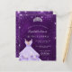 Une invitation moderne, élégante et glamour pour une Quinceañera, 15ème anniversaire. Un arrière - plan violet profond avec de la poussière de parties scintillant, une tiare et une robe. La couleur violette est inégale. Le nom est écrit avec un script de style moderne écrit à la main. Personnalisez et ajoutez les détails de votre fête.