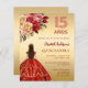 Une invitation moderne, élégante et glamour pour une Quinceañera, 15ème anniversaire. Un arrière - plan en faux or, une fille portant une robe rouge et or et des roses rouges, roses et dorés, des fleurs. Le nom est écrit avec un script de style moderne écrit à la main. Personnalisez et ajoutez les détails de votre fête. 1 feuille = 1 invite imprimé bord à bord.