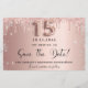 Une petite fille et tendance Enregistrer la carte Date pour une Quinceañera, 15e anniversaire fête. arrière - plan d'or rose décoré avec de l'or rose et des gouttes et de la poussière d'argent faux. Personnalisez et ajoutez une date et un nom/texte. Le texte : Save the Date est écrit avec un grand script de style à la main tendance avec des swashes. Numéro 15 avec une police de style ballon.