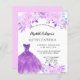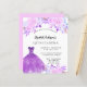 Une invitation moderne, élégante et glamour pour une Quinceañera, 15ème anniversaire. Un arrière - plan blanc aux fleurs roses rousses, une robe violette. Le nom est écrit avec un script de style moderne écrit à la main. Personnalisez et ajoutez les détails de votre fête. 1 feuille = 1 invite imprimé bord à bord.
