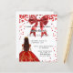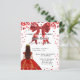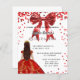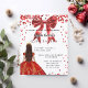Une invitation moderne, élégante et glamour pour une Quinceañera, 15ème anniversaire. Un arrière - plan blanc aux confettis, une robe rouge et un arc rouge. Le nom est écrit avec un script de style moderne écrit à la main. Personnalisez et ajoutez les détails de votre fête. 1 feuille = 1 invite imprimé bord à bord.
