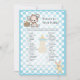 Qu'y a-t-il dans votre sac à main ? Un jeu de baby shower de pique-nique qui comprend un ours en peluche mignon et son ami lapin lapin, une corbeille de pique-nique, et une bouteille de lait sur un arrière - plan motif à chèque bleu blanc. Des modèles ont été fournis sur le dos.