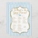 What's In Your Purse jeu pour baby shower et douche nuptiale. Avec des rayures bleu et blanc clair et un accent de parties scintillant d'or faux et du texte or. Cet élégant jeu rayé de Purse Game vous apportera des rires et des sourires à votre prochaine douche.