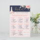 Un jeu de bridal shower élégant, stylé et tendance "qu'est-ce qu'il y a dans votre sac" pour une fête de fiançailles dans un jardin de roses florales. Le design présente notre robe de mariée peinte à la main, chic, élégante et moderne en blanc transparent et rose blush pâle avec un jardin botanique de roses et de fleurs en fleurs. La robe fleurie est suspendue à un cintre orné de style vintage en faux or. Les détails en dentelle de fleurs douces et les embellissements scintillants sur la robe de mariée créent un look magnifique, sophistiqué et luxueux. Une typographie "Bridal" en écriture manuscrite de style script en or. La palette de couleurs bleu marine, rose blush et faux or crée un look tendance, shabby chic et de style vintage. Des roses florales aquarelles encadrent le haut. Le verso présente un fond rose pâle blush minimaliste avec un
