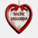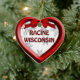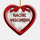 Un design graphique de flocons de neige dans un cadre rouge 3D en forme de coeur Racine Wisconsin ornement de Noël. L'ornement a des modèles texte pour votre personnalisation. ©2012charmainepaulson