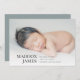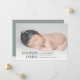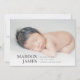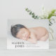 La carte de faire-part de naissance minimaliste moderne comprend une photo horizontale ou orientée paysage avec le nom du bébé, les statistiques de naissance et une signature familiale alignée en bas dans un élégant lettrage classique. Ajoutez trois photos carrés supplémentaires à l'arrière.