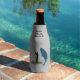 Un pêcheur en silhouette se dresse sur une rive d'une rivière avec un gros poisson dansant sur sa ligne au premier plan dans le design simple, quatre couleurs sur ce glacière de bouteille. Tout le texte peut être facilement customisé.