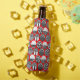 Ce glacière de bouteille a un design géométrique des ovales avec différents motifs en gris dans chaque moitié sur un champ de rouge.