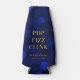Glacière élégante présentant les mots "Pop Fizz Clink" en faux papier métallisé doré sur un fond à motifs de lumières bokeh bleu saphir. Parfait pour les fêtes de fiançailles, les mariages, les anniversaires ou divers autres événements.