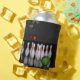Un refroidisseur de boîte avec un rack de broches de bowling avec une boule de bowling verte qui leur arrive.