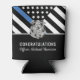 Cette conception comprend un drapeau de la police avec des rayures noires et blanches, ainsi qu'une fine bande bleue. Une excellente façon de féliciter la nouvelle académie de police diplômée. Customisez avec le nom de l'agent d'application de la loi diplômé en argent. Célébrez cette étape importante dans le style!