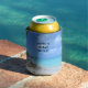 Can cooler with a scenic tropical photograph. A secluded beach with white sand and turquoise water.