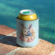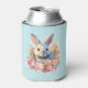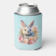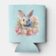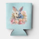 A can cooler with a watercolor image. A white gray bunny rabbit surrounded by a garland of pink and peach roses. For bunny lovers and Easter themes and birthdays and showers.