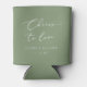 Mariage ou fiançailles branché peut refroidir avec "cheers to love" en blanc police de calligraphie moderne sur un arrière - plan vert sage. Personnalisez avec vos noms et votre date de mariage en dessous.