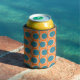 Cette boîte de refroidissement a un design moderne du milieu du siècle de cercles orange ouvert avec des cercles turquoises solides qui traversent le motif avec des lignes verticales turquoises et des lignes horizontales orange.