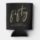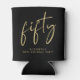 Fun black can coolers for her 50th birthday party featuring "fifty" in a chic gold script and her name in modern lettering.