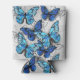 Vertical composition of réalistes, blue and white morpho butterflies on gray textured background. Morphine bleu.