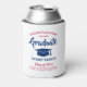 Ajoutez une touche personnalisée aux décorations de la fête de remise des diplômes du collège ou du secondaire avec des refroidisseurs de boîtes rouges, blanches et bleues. Design comprend un arrière - plan blanc, un casquette en carton bleu, une typographie moderne élégante, une calligraphie manuscrite de style, et un message personnalisable lisant "Félicitations à notre diplômé". Le texte en bas comprend l'année de classe, le nom de l'école et une ligne facultative pour le diplôme, les distinctions honorifiques ou d'autres informations. Tout le texte est simple à customiser. Ces faveurs élégantes font une idée de boisson de célébration de graduation élégante. Santé!